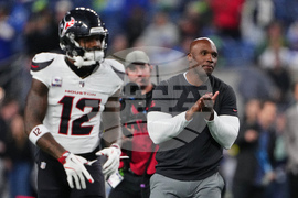 Houston Texans head coach DeMeco Ryans watches play against the Seattle Seahawks in the second half of an NFL football game Monday, Oct. 20, 2025, in Seattle. (AP Photo/Lindsey Wasson)