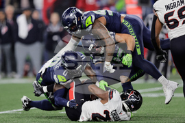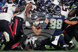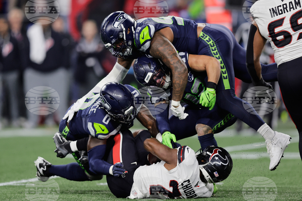 Houston Texans running back Nick Chubb, bottom, is stopped as he carries the ball by Seattle Seahawks' DeMarcus Lawrence (0), Drake Thomas, center right, and Leonard Williams, top, in the first half of an NFL football game Monday, Oct. 20, 2025, in Seattle. (AP Photo/John Froschauer)