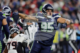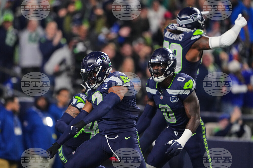 Seattle Seahawks' Leonard Williams (99) and Drake Thomas, right, celebrate a defensive stop against the Houston Texans in the first half of an NFL football game Monday, Oct. 20, 2025, in Seattle. (AP Photo/John Froschauer)