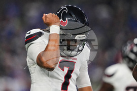 Fans look on as Houston Texans quarterback C.J. Stroud (7) jogs off the field after an NFL football game against the Seattle Seahawks Monday, Oct. 20, 2025, in Seattle. (AP Photo/Lindsey Wasson)