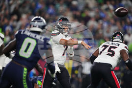 Houston Texans quarterback C.J. Stroud (7) looks at the incomplete pass after being hit by Seattle Seahawks linebacker Ernest Jones IV in the first half of an NFL football game Monday, Oct. 20, 2025, in Seattle. (AP Photo/John Froschauer)