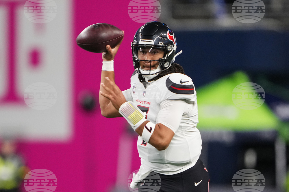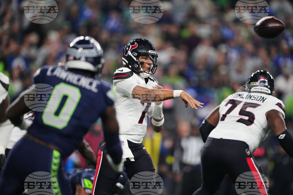 Houston Texans quarterback C.J. Stroud throws a pass in the first half of an NFL football game against the Seattle Seahawks Monday, Oct. 20, 2025, in Seattle. (AP Photo/Lindsey Wasson)