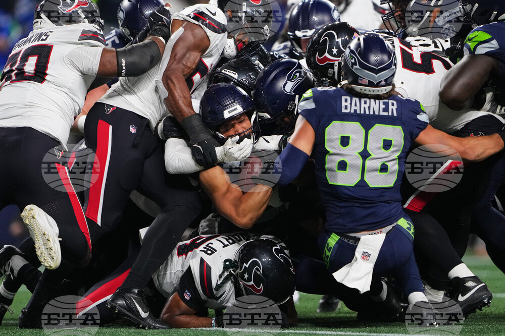 Houston Texans quarterback C.J. Stroud (7) recovers after running the ball as Seattle Seahawks' DeMarcus Lawrence (0), Ernest Jones IV, center, right, and Drake Thomas (42) look on in the second half of an NFL football game Monday, Oct. 20, 2025, in Seattle. (AP Photo/Lindsey Wasson)
