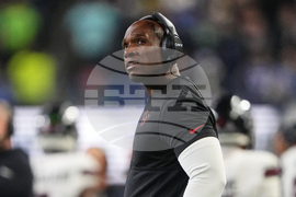 Houston Texans head coach DeMeco Ryans watches after the Seattle Seahawks scored a touchdown in the first half of an NFL football game Monday, Oct. 20, 2025, in Seattle. (AP Photo/Lindsey Wasson)