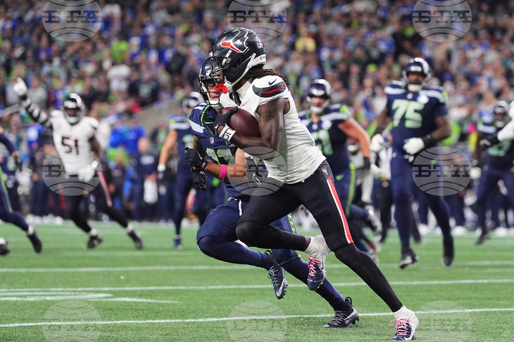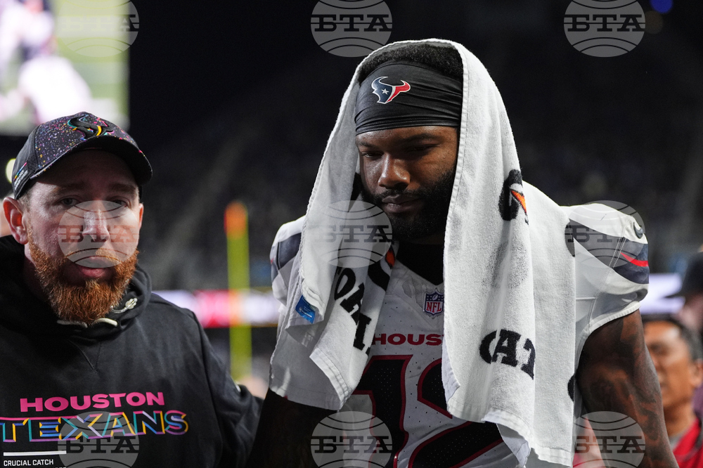 Houston Texans wide receiver Nico Collins is assited by a staff member after suffering an unknown injury in the second half of an NFL football game against the Seattle Seahawks Monday, Oct. 20, 2025, in Seattle. (AP Photo/Lindsey Wasson)