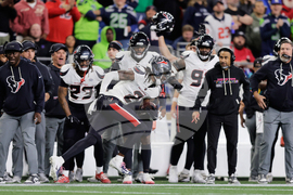 The sideline celebrates after Houston Texans safety Calen Bullock (2) intercepted a Seattle Seahawks pass in the first half of an NFL football game Monday, Oct. 20, 2025, in Seattle. (AP Photo/John Froschauer)