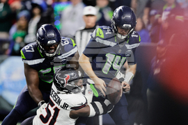 Seattle Seahawks quarterback Sam Darnold (14) is stripped of the ball by Houston Texans defensive end Will Anderson Jr. (51) as Charles Cross (67) helps defend on the play in the second half of an NFL football game Monday, Oct. 20, 2025, in Seattle. (AP Photo/John Froschauer)