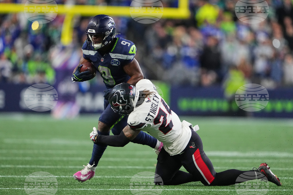 Seattle Seahawks running back Kenneth Walker III (9) is tackled by Houston Texans cornerback Derek Stingley Jr., right, in the second half of an NFL football game Monday, Oct. 20, 2025, in Seattle. (AP Photo/Lindsey Wasson)