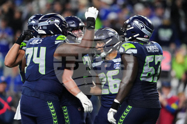 Seattle Seahawks' Nick Emmanwori (3) and Uchenna Nwosu (7) celebrate a defensive stop agianst the Houston Texans in the second half of an NFL football game Monday, Oct. 20, 2025, in Seattle. (AP Photo/John Froschauer)