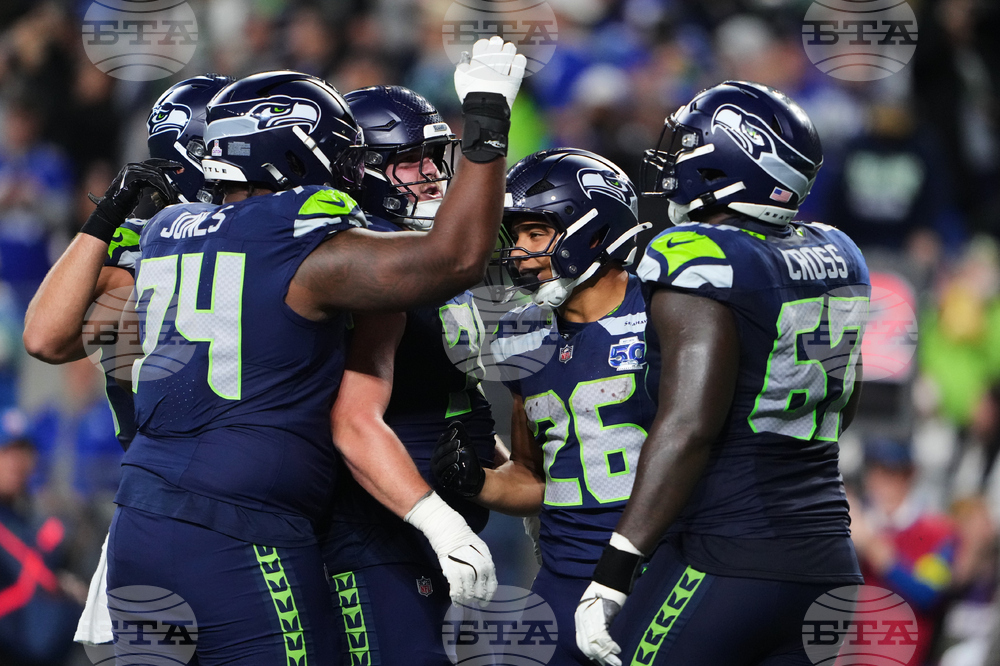 Seattle Seahawks' Zach Charbonnet (26) celebrtates with Josh Jones (74), Charles Cross (67) and others after Charbonnet ran the ball for a touchdown in the second half of an NFL football game against the Houston Texans Monday, Oct. 20, 2025, in Seattle. (AP Photo/Lindsey Wasson)