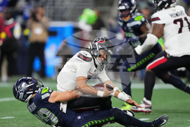 Houston Texans quarterback C.J. Stroud, top, is sacked by Seattle Seahawks safety Ty Okada (39) in the second half of an NFL football game Monday, Oct. 20, 2025, in Seattle. (AP Photo/Lindsey Wasson)