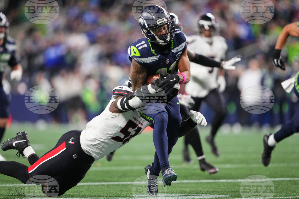 Seattle Seahawks wide receiver Jaxon Smith-Njigba (11) is tackled by Houston Texans defensive end Will Anderson Jr. (51) in the second half of an NFL football game Monday, Oct. 20, 2025, in Seattle. (AP Photo/Lindsey Wasson)