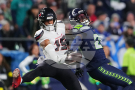 Seattle Seahawks cornerback Riq Woolen, right, breaks up a pass intended for Houston Texans' Xavier Hutchinson (19) in the second half of an NFL football game Monday, Oct. 20, 2025, in Seattle. (AP Photo/Lindsey Wasson)