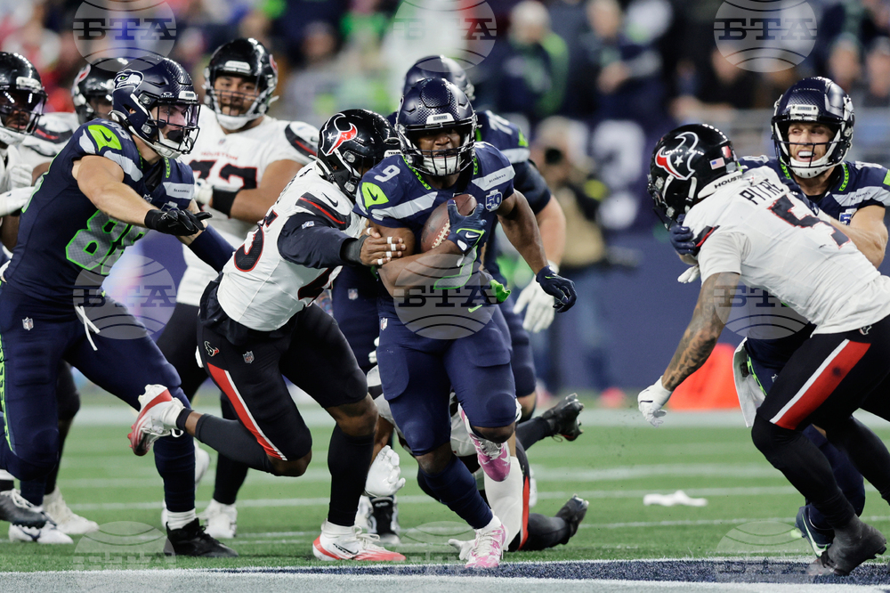 Seattle Seahawks running back Kenneth Walker III (9) runs the ball as Houston Texans' Jalen Pitre (5) and others attempt to make the stop in the second half of an NFL football game Monday, Oct. 20, 2025, in Seattle. (AP Photo/John Froschauer)