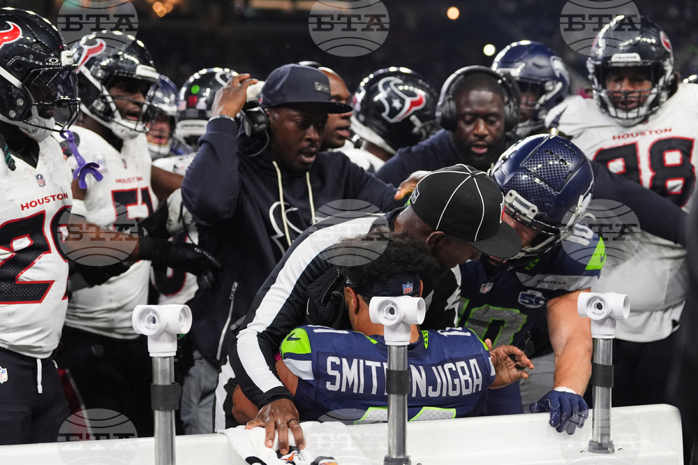 An official and Seattle Seahawks' Cooper Kupp (10) lean over Jaxon Smith-Njigba, sitting on Houston Texans team bench, after the Texans' Derek Stingley Jr. intercepted a pass late in the second half of an NFL football game Monday, Oct. 20, 2025, in Seattle. (AP Photo/Lindsey Wasson)