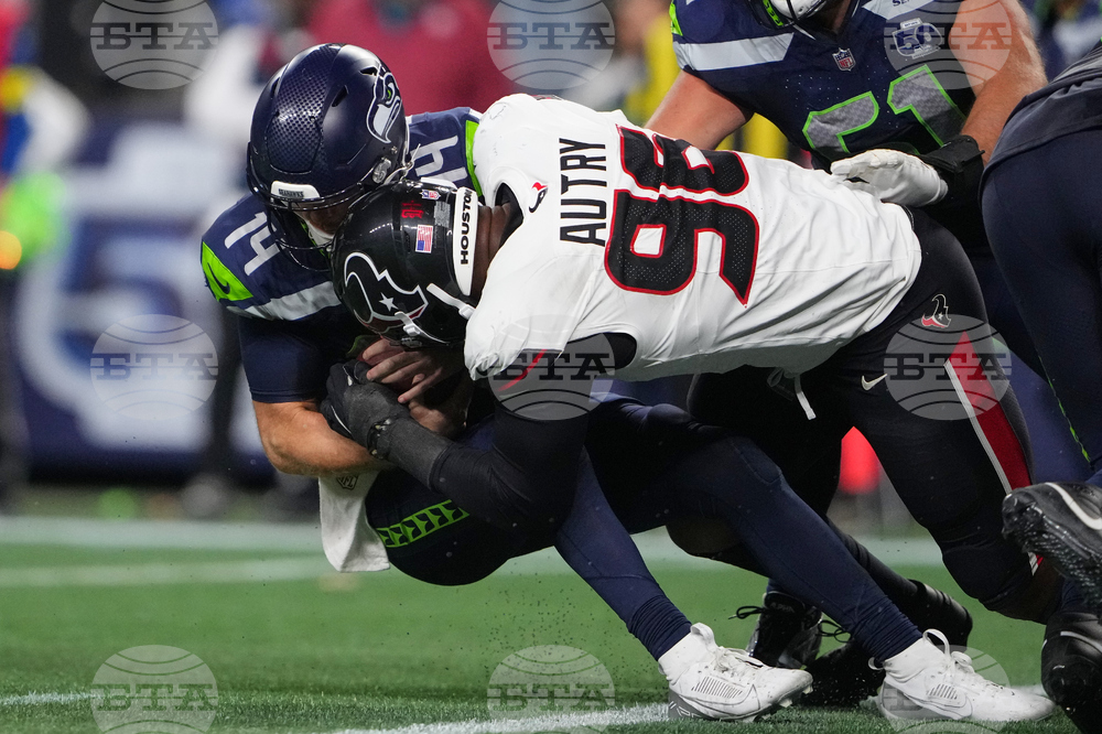 Houston Texans defensive end Denico Autry (96) sacks Seattle Seahawks' Sam Darnold (14) in the second half of an NFL football game Monday, Oct. 20, 2025, in Seattle. (AP Photo/Lindsey Wasson)