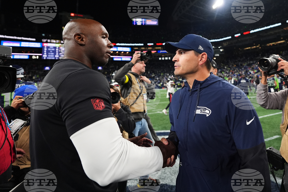 Houston Texans head coach DeMeco Ryans, left, and Seattle Seahawks head coach Mike Macdonald, right, greet each other after their team's NFL football game Monday, Oct. 20, 2025, in Seattle. (AP Photo/Lindsey Wasson)