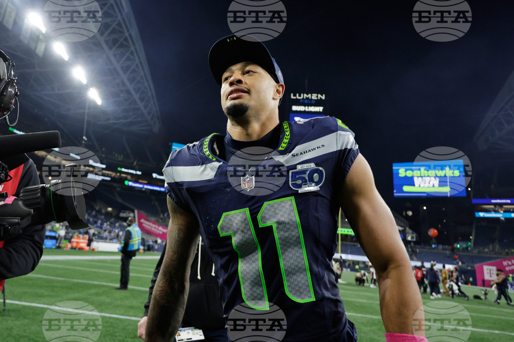 Seattle Seahawks wide receiver Jaxon Smith-Njigba responds to questions during a news conference after an NFL football game against the Houston Texans Monday, Oct. 20, 2025, in Seattle. (AP Photo/Lindsey Wasson)