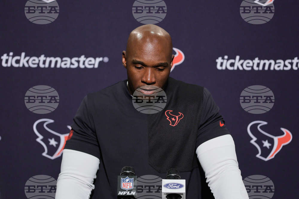 Houston Texans head coach DeMeco Ryans takes questions during a news conference after an NFL football game against the Seattle Seahawks Monday, Oct. 20, 2025, in Seattle. (AP Photo/John Froschauer)