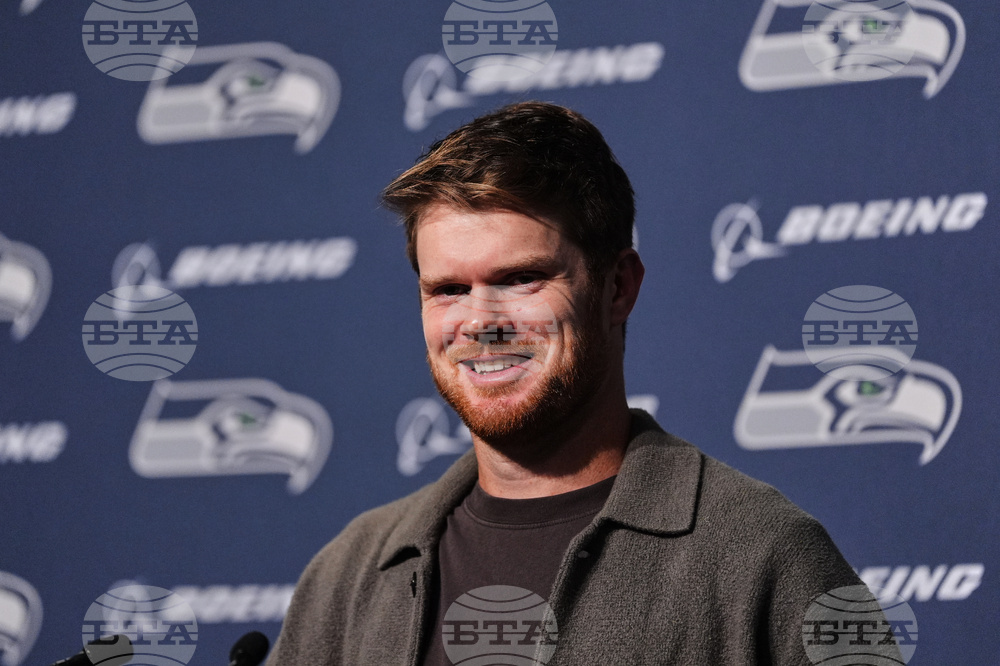 Seattle Seahawks quarterback Sam Darnold responds to questions during a news conference after the team's NFL football game against the Houston Texans Monday, Oct. 20, 2025, in Seattle. (AP Photo/Lindsey Wasson)