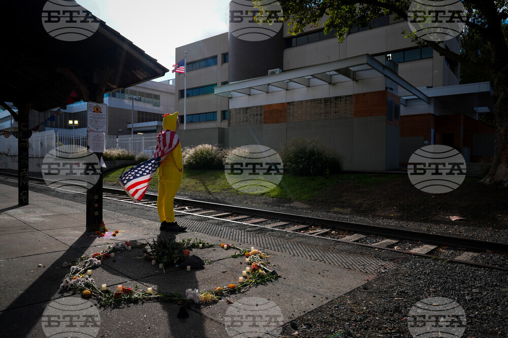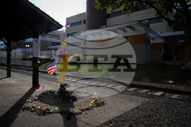 American flags line a fence across the street from a United States Immigration and Customs Enforcement (ICE) facility in Portland, Ore., Monday, Oct. 20, 2025. (AP Photo/Jenny Kane)