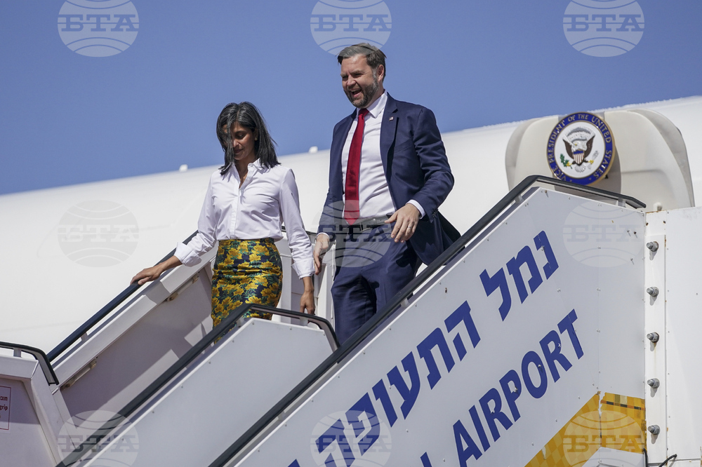 Vice President J.D. Vance, right, and Second Lady Usha Vance arrive at Ben Gurion airport in Tel Aviv, Israel, Monday, Oct. 21, 2025. (Nathan Howard/Pool Photo via AP)