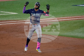 Seattle Mariners' Julio Rodríguez celebrates his solo home run against the Toronto Blue Jays during the third inning in Game 7 of baseball's American League Championship Series, Monday, Oct. 20, 2025, in Toronto. (AP Photo/David J. Phillip)