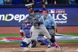 Seattle Mariners' Julio Rodríguez follows through on a solo home run against the Toronto Blue Jays during the third inning in Game 7 of baseball's American League Championship Series, Monday, Oct. 20, 2025, in Toronto. (AP Photo/David J. Phillip)