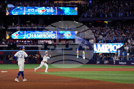 Toronto Blue Jays players celebrate after their Game 7 win over the Seattle Mariners to take baseball's American League Championship Series in Toronto, Monday, Oct. 20, 2025. (Chris Young/The Canadian Press via AP)