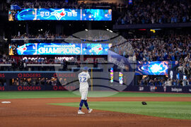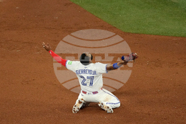 Toronto Blue Jays first baseman Vladimir Guerrero Jr. celebrates after his team's Game 7 win over the Seattle Mariners to take baseball's American League Championship Series in Toronto, Monday, Oct. 20, 2025. (Chris Young/The Canadian Press via AP)