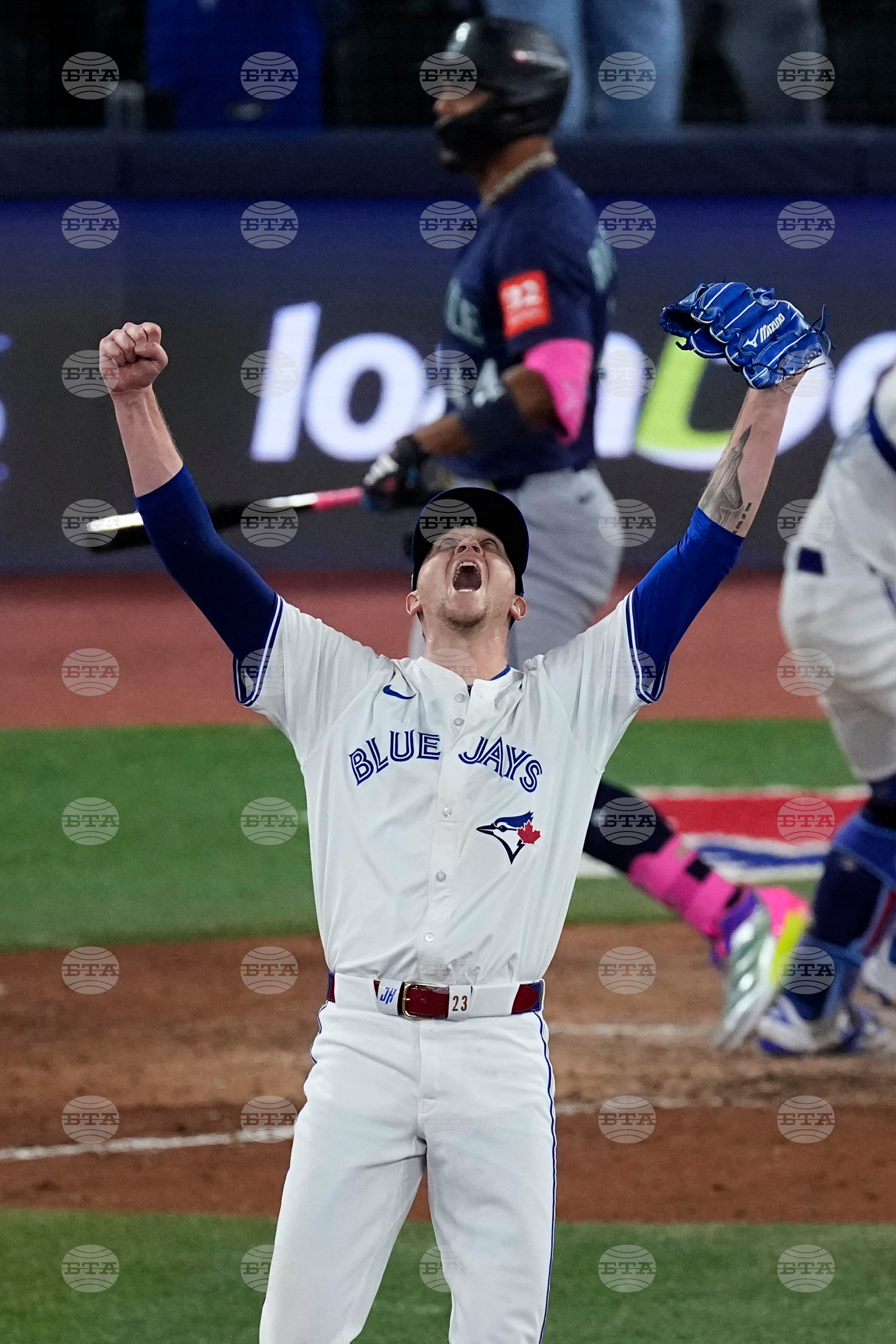 Toronto Blue Jays pitcher Jeff Hoffman celebrates the final out of Game 7 of baseball's American League Championship Series as Seattle Mariners Julio Rodríguez walks off the field, Monday, Oct. 20, 2025, in Toronto. (AP Photo/David J. Phillip)