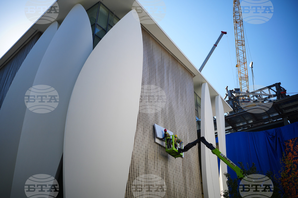 Workers on a platform install boards on a new fashion boutique under construction at the capital popular shopping district, in Beijing, Tuesday, Oct. 21, 2025. (AP Photo/Andy Wong)