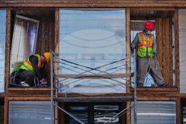 Workers install scaffolding at a building under construction at the capital popular shopping district, in Beijing, Tuesday, Oct. 21, 2025. (AP Photo/Andy Wong)