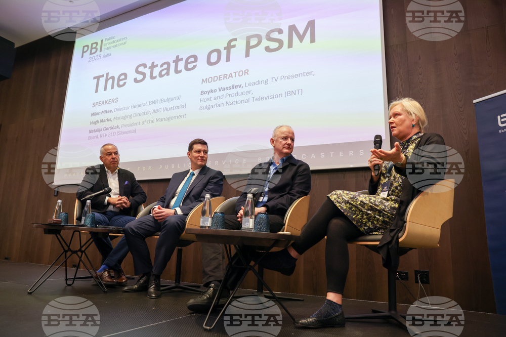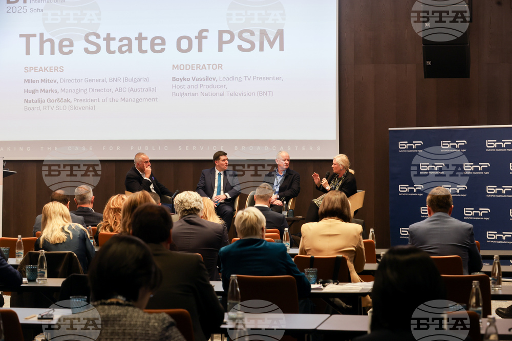 София (21 октомври 2025) Първи панел от Годишната конференция на Международната асоциация на обществените медии (Public Broadcasters International) на тема „Състоянието на обществените медии“ се провежда в зала „Васил Левски“ на хотел „Хаят Риджънси“. На снимката (от ляво надясно): телевизионният водещ и продуцент в Българска национална телевизия (БНТ) Бойко Василев, генералният директор на Българското национално радио (БНР) Милен Митев, управляващият директор на ABC (Австралия) Хю Маркс, председателят на управителния съвет в RTV SLO (Словения) Наталия Горшчак.