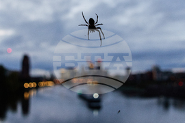 A spider hangs down from the railing of a bridge in Frankfurt, Germany, Tuesday, Oct. 21, 2025. (AP Photo/Michael Probst)
