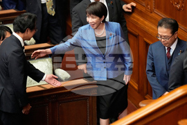 Sanae Takaichi, center, bows as she was elected as Japan's new prime minister during the extraordinary session of the lower house, in Tokyo, Japan, Tuesday, Oct. 21, 2025.(AP Photo/Eugene Hoshiko)