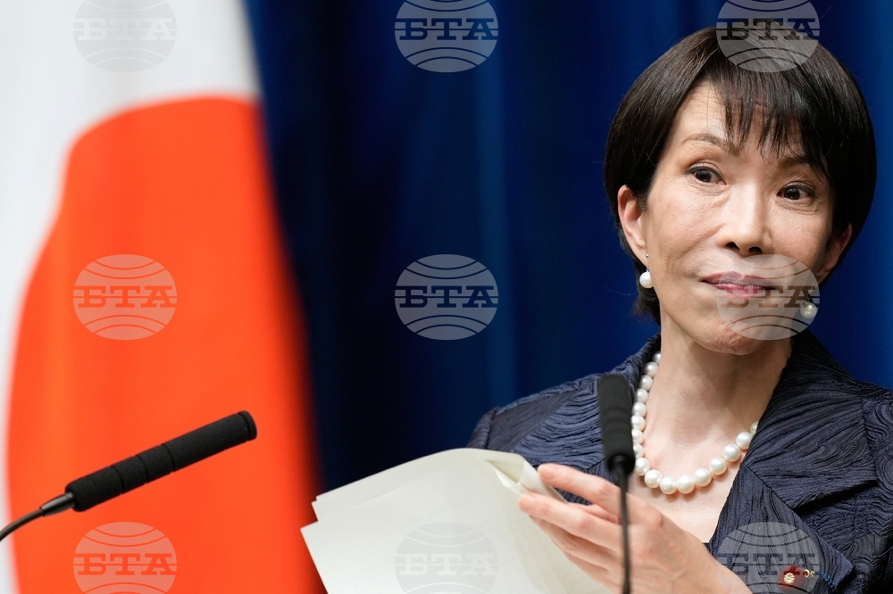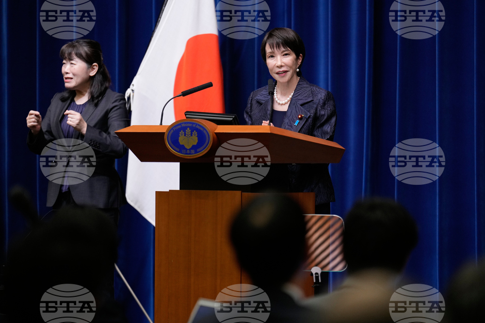Japan's new Prime Minister Sanae Takaichi, center rear, speaks during a press conference at the prime minister's office in Tokyo, Japan, Tuesday, Oct. 21, 2025.(AP Photo/Eugene Hoshiko, Pool)