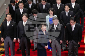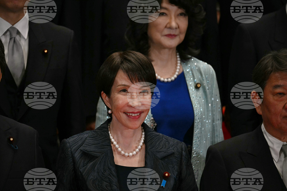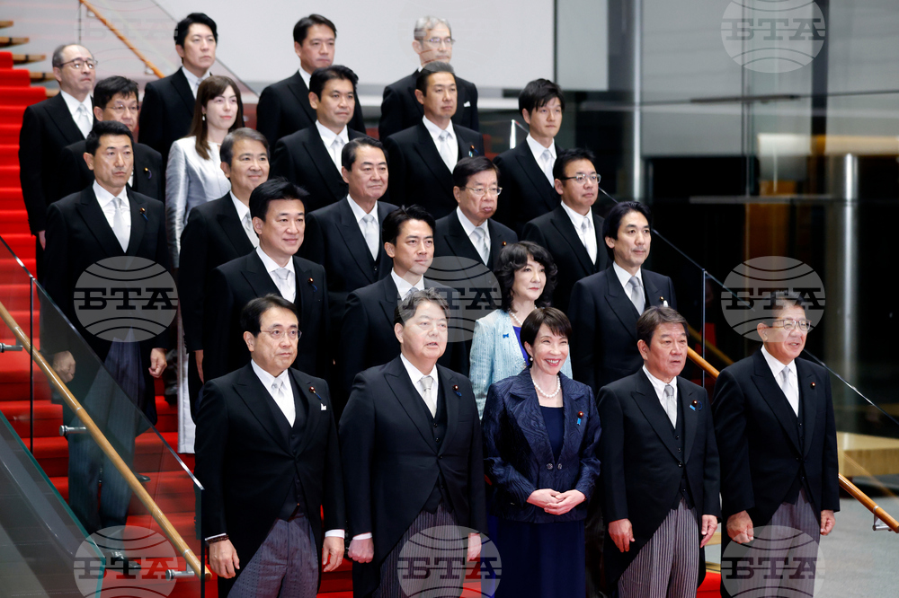 Japan Prime Minister Sanae Takaichi, front center, and her new cabinet members pose for a group photo in Tokyo, Oct. 21, 2025. (Jia Haocheng/Pool via AP)