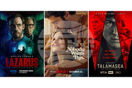 This combination of images shows promotional art for "Lazarus," from left, "Nobody Wants This," and "Talamasca." (Prime/Netflix/AMC via AP)