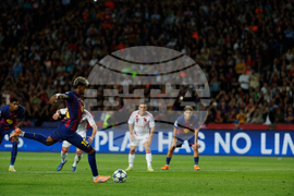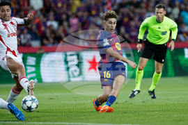 Barcelona's Fermin Lopez scores the opening goal of his team during the Champions League opening phase soccer match between Barcelona and Olympiacos in Barcelona, Spain, Tuesday, Oct. 21, 2025. (AP Photo/Joan Monfort)