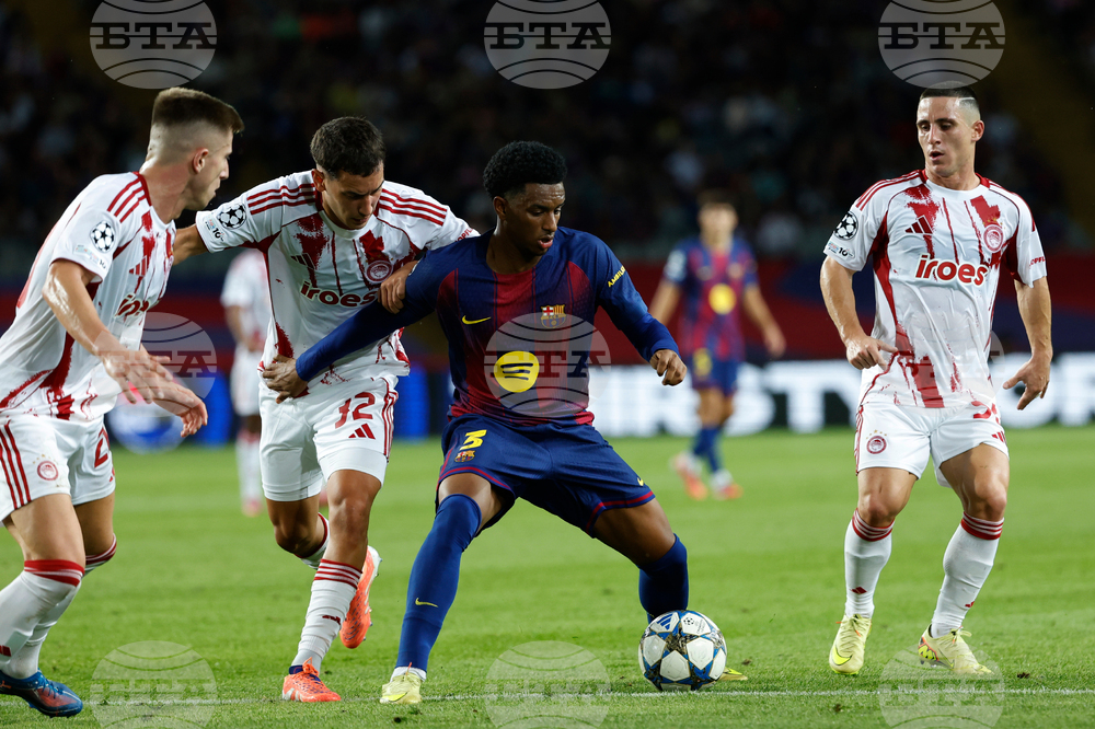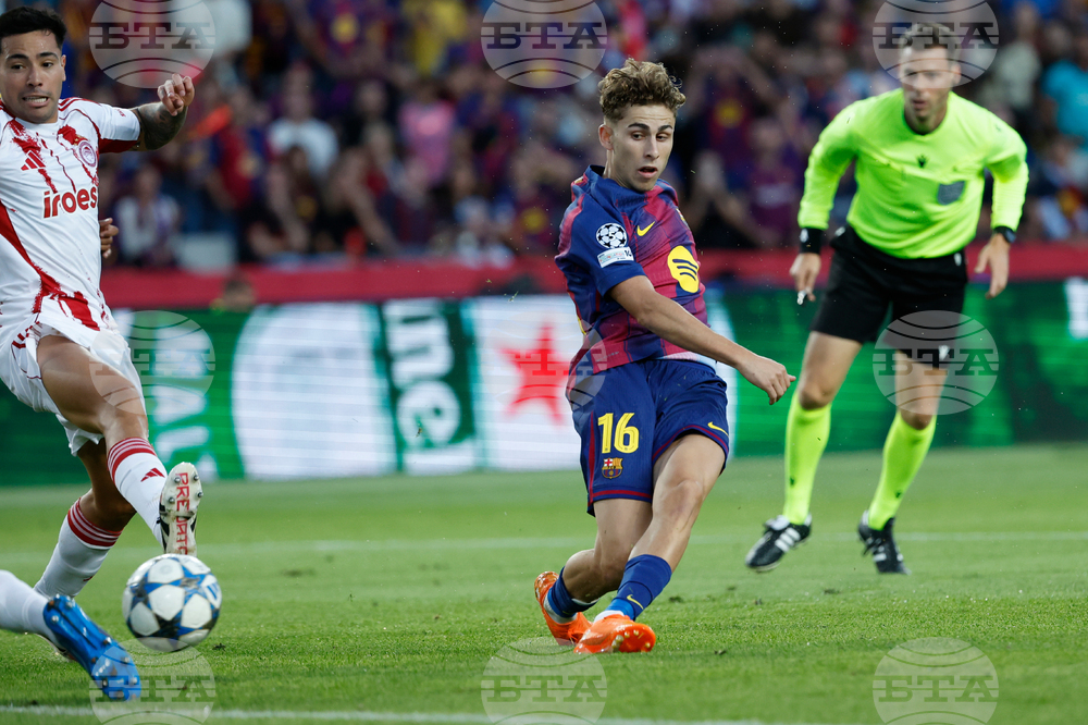 Barcelona's Fermin Lopez, background, scores his side's second goal as Olympiacos' Panagiotis Retsos tries to stop him during the Champions League opening phase soccer match between Barcelona and Olympiacos in Barcelona, Spain, Tuesday, Oct. 21, 2025. (AP Photo/Joan Monfort)