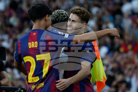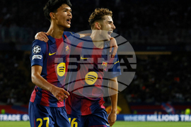 Barcelona's Fermin Lopez, right, celebrates with Dro Fernandez after scoring his side's second goal during the Champions League opening phase soccer match between Barcelona and Olympiacos in Barcelona, Spain, Tuesday, Oct. 21, 2025. (AP Photo/Joan Monfort)