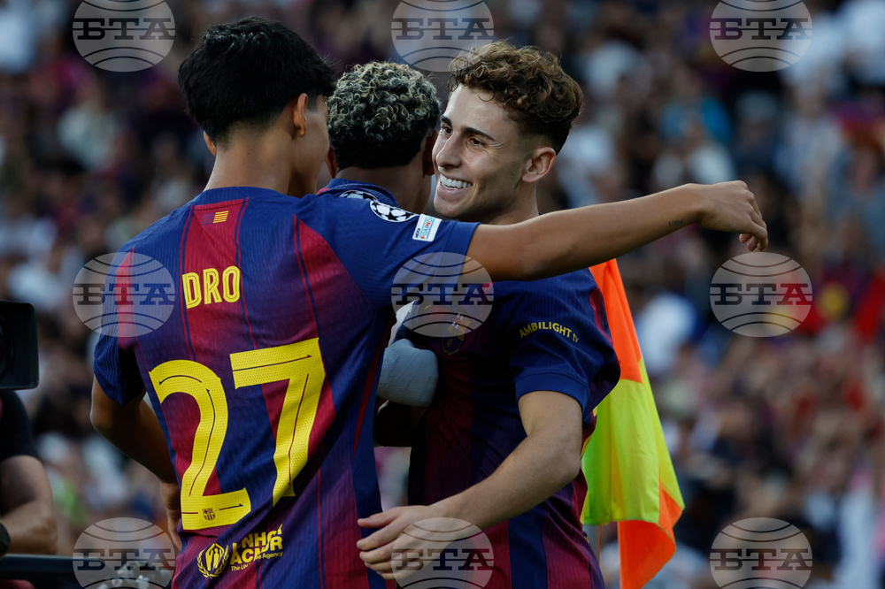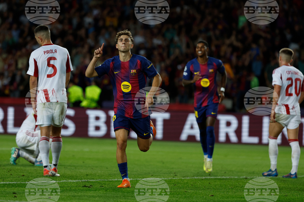 Barcelona's Fermin Lopez, right, celebrates with teammates after scoring the opening goal of his team during the Champions League opening phase soccer match between Barcelona and Olympiacos in Barcelona, Spain, Tuesday, Oct. 21, 2025. (AP Photo/Joan Monfort)