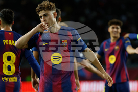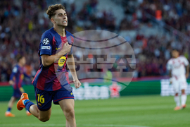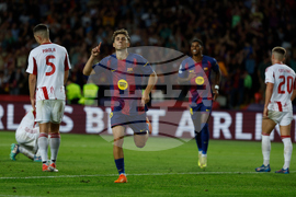 Barcelona's Fermin Lopez celebrates after scoring the opening goal of his team during the Champions League opening phase soccer match between Barcelona and Olympiacos in Barcelona, Spain, Tuesday, Oct. 21, 2025. (AP Photo/Joan Monfort)
