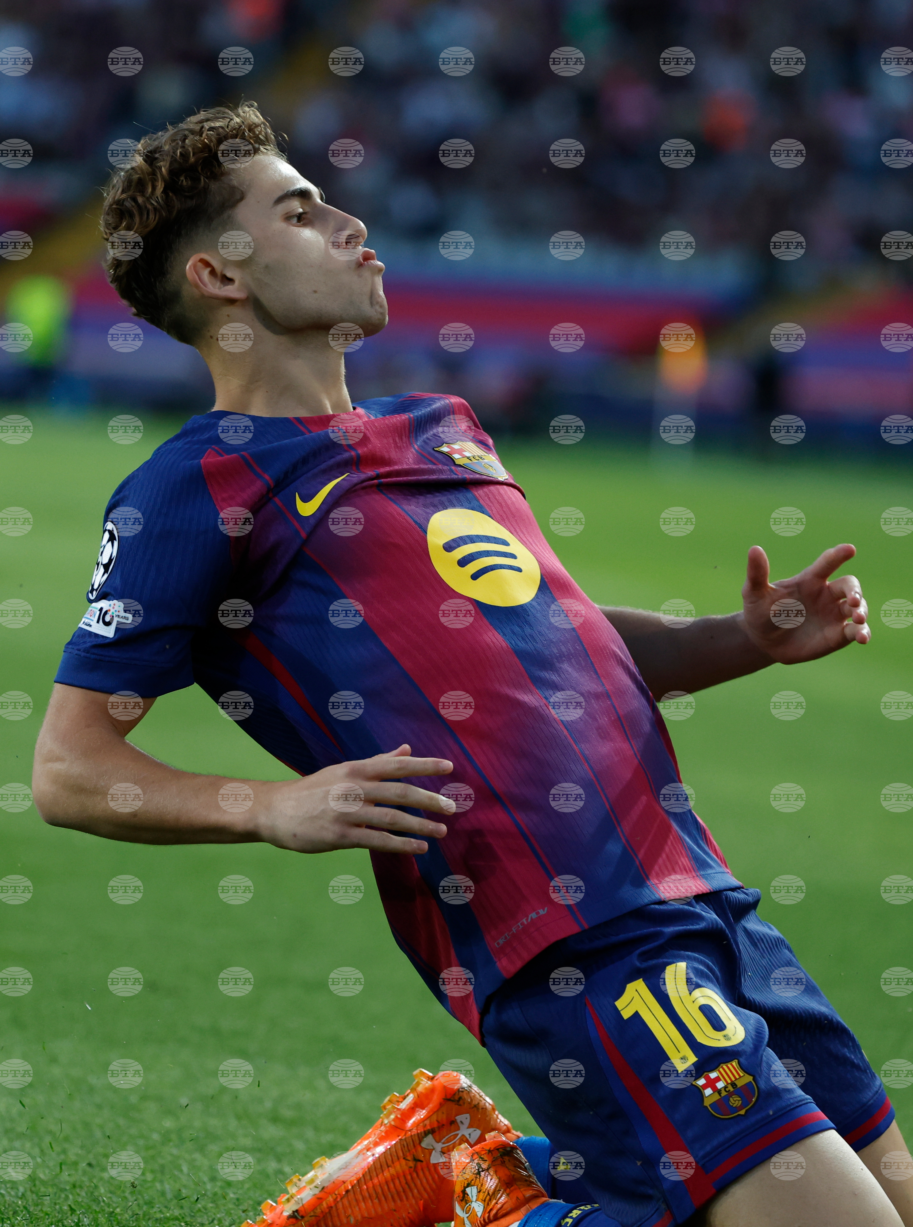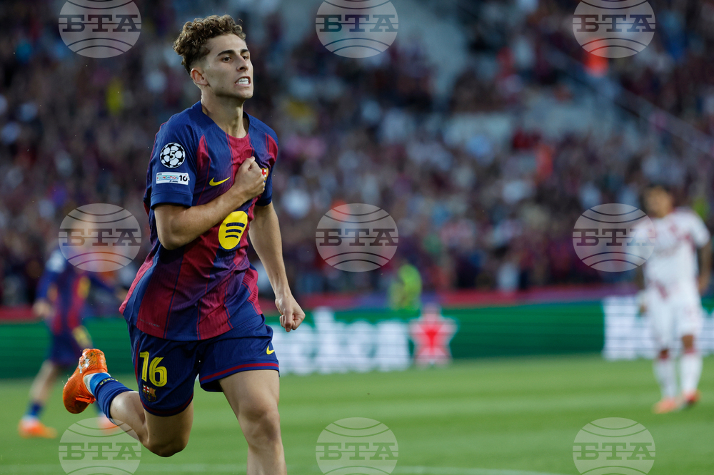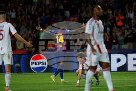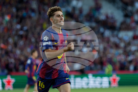 Barcelona's Fermin Lopez celebrates after scoring his side's fifth goal during the Champions League opening phase soccer match between Barcelona and Olympiacos in Barcelona, Spain, Tuesday, Oct. 21, 2025. (AP Photo/Joan Monfort)