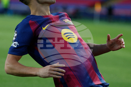 Barcelona's Eric Garcia reacts during the Champions League opening phase soccer match between Barcelona and Olympiacos in Barcelona, Spain, Tuesday, Oct. 21, 2025. (AP Photo/Joan Monfort)