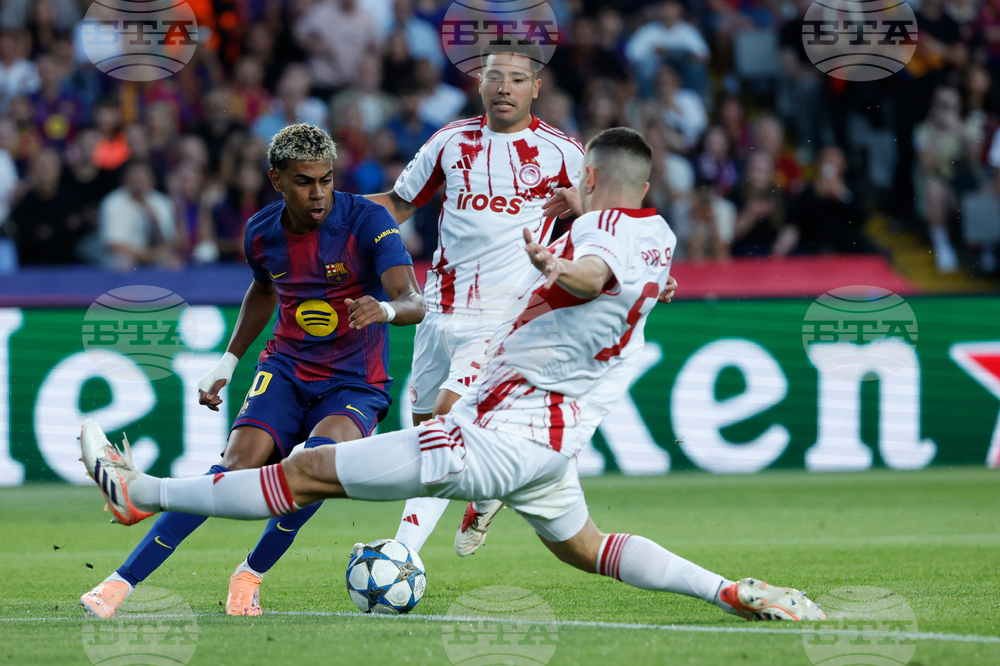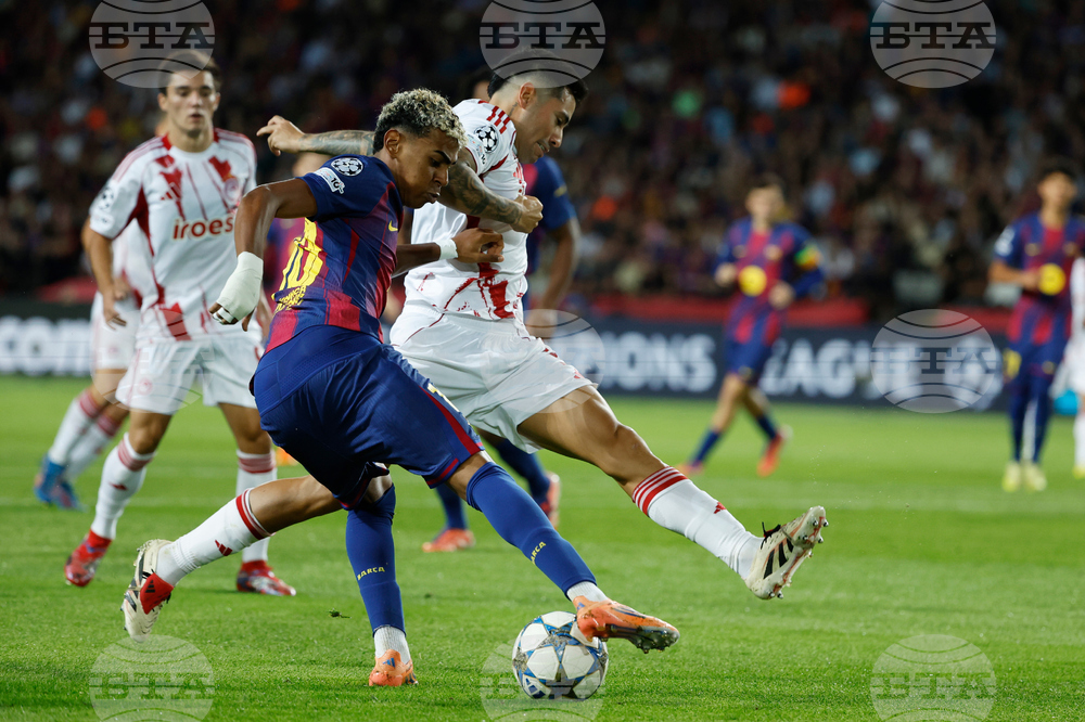 Barcelona's Lamine Yamal, foreground, and Olympiacos' Francisco Ortega vie for the ball during the Champions League opening phase soccer match between Barcelona and Olympiacos in Barcelona, Spain, Tuesday, Oct. 21, 2025. (AP Photo/Joan Monfort)