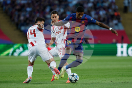 Olympiacos' Costinha, bottom, tries to stop Barcelona's Alejandro Balde during the Champions League opening phase soccer match between Barcelona and Olympiacos in Barcelona, Spain, Tuesday, Oct. 21, 2025. (AP Photo/Joan Monfort)