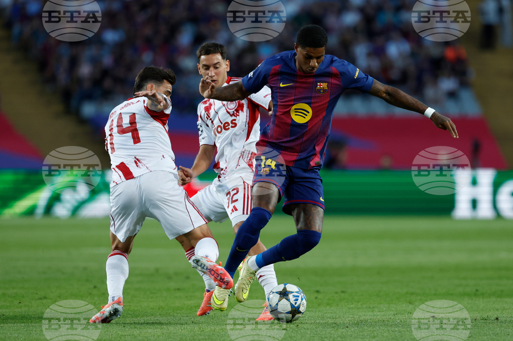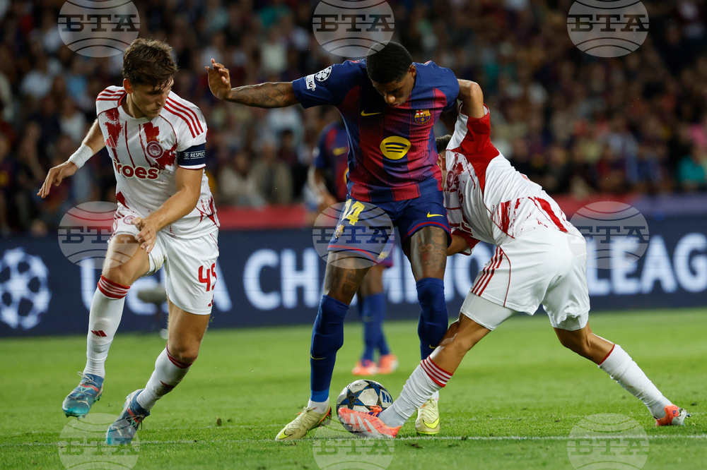 Olympiacos' Santiago Hezze, right, and Panagiotis Retsos, left, defend against Barcelona's Marcus Rashford during the Champions League opening phase soccer match between Barcelona and Olympiacos in Barcelona, Spain, Tuesday, Oct. 21, 2025. (AP Photo/Joan Monfort)