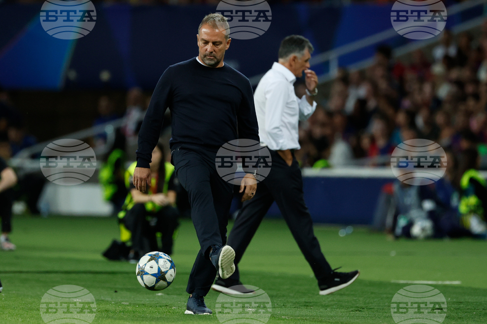 Barcelona's head coach Hansi Flick kicks the ball during the Champions League opening phase soccer match between Barcelona and Olympiacos in Barcelona, Spain, Tuesday, Oct. 21, 2025. (AP Photo/Joan Monfort)